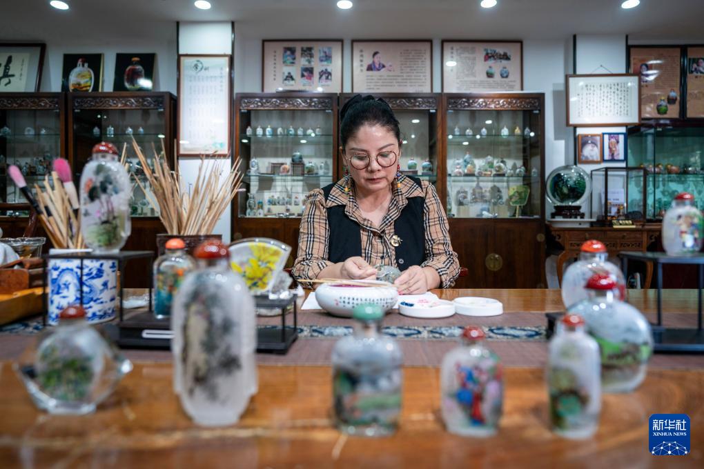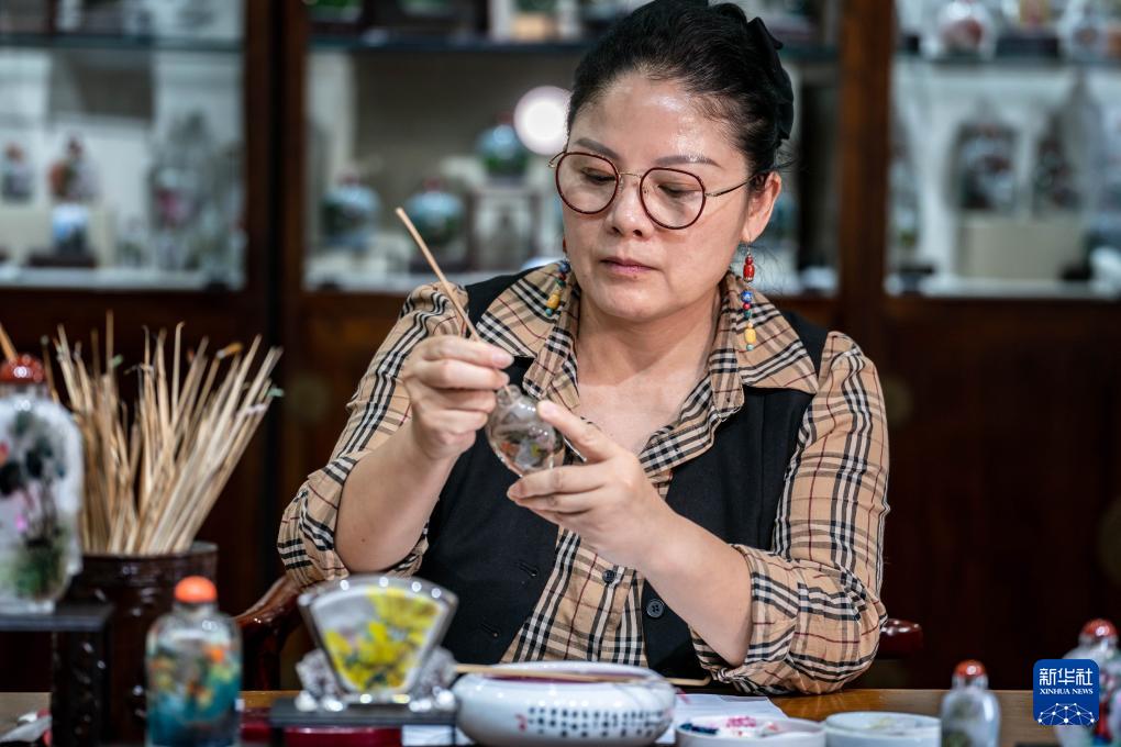 孙鸿雁在位于昆明官渡古镇的滇派内画传习馆内进行内画创作(7月3日摄)。(新华社记者 陈欣波 摄)