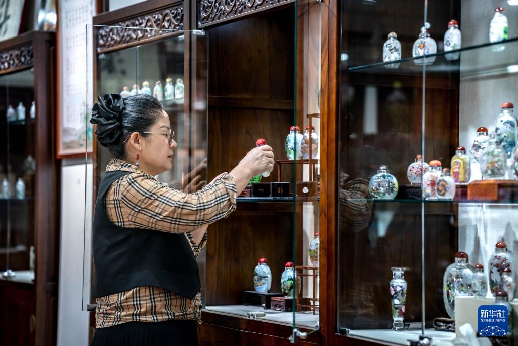 孙鸿雁在位于昆明官渡古镇的滇派内画传习馆内整理展柜里的内画工艺品(7月3日摄)。(新华社记者 胡超 摄)