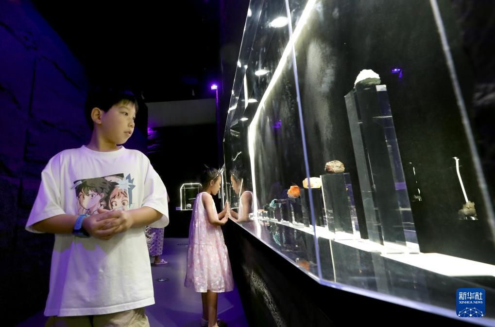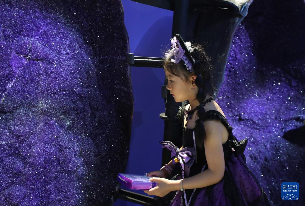 7月16日,一名小朋友在重逾1吨的“巨无霸满天星”晶洞前驻足观看。(新华社记者 方喆 摄)