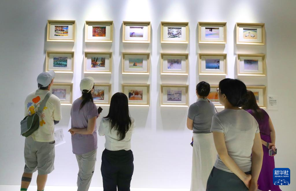 7月16日,参观者在宝石画艺术家刘全霞的作品墙前驻足观看。(新华社记者 方喆 摄)