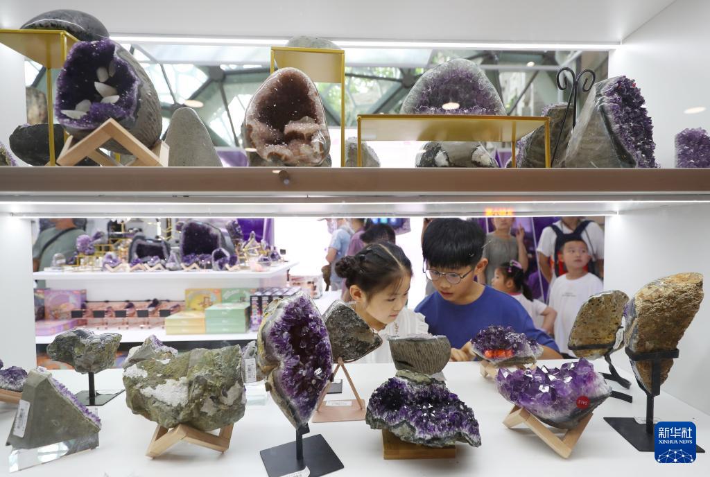 7月16日,两名小朋友在纪念品商店内一组紫水晶摆件前驻足观看。(新华社记者 方喆 摄)