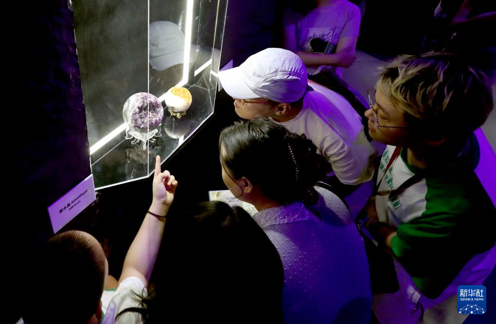 7月16日,参观者在一组产自巴西的玛瑙外壳紫水晶球体展品前驻足观看。(新华社记者 方喆 摄)