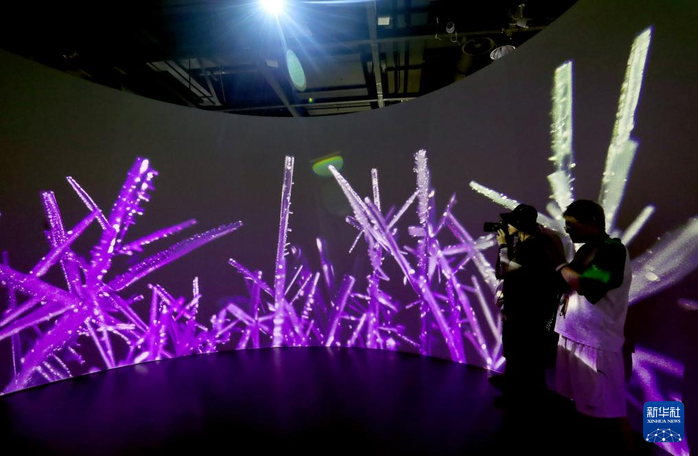 7月16日,参观者在球幕前观看展示水晶产生过程的影片。(新华社记者 方喆 摄)