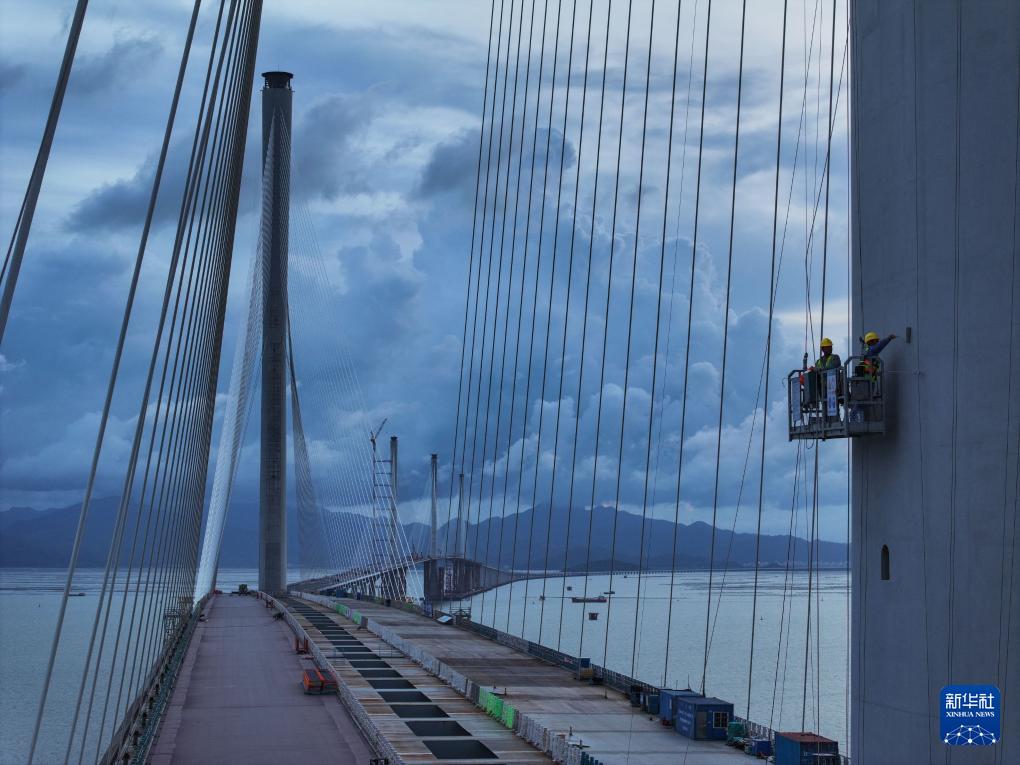 目前,中交路建承建的黄茅海跨海通道高栏港大桥已经进入索塔塔身涂装施工,被誉为海上“小蛮腰”的索塔单座涂装面积近万平方米。