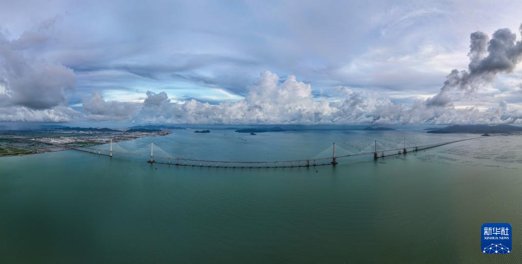 黄茅海跨海通道高栏港大桥(左)和黄茅海大桥(7月16日摄,无人机全景照片)。(新华社记者 刘大伟 摄)