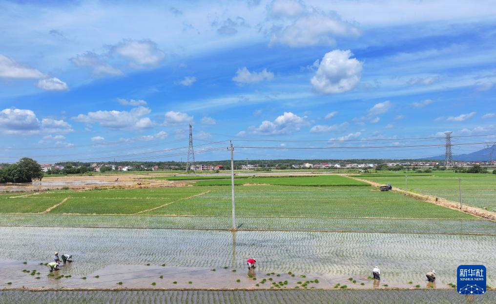 7月17日,湖南省衡阳市衡东县霞流镇村民进行晚稻耕种作业(无人机照片)。(新华社发 曹正平 摄)