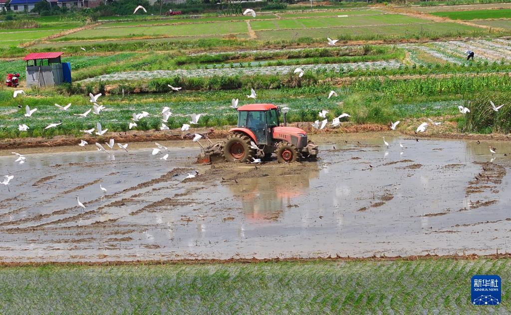 7月17日,湖南省衡阳市衡东县霞流镇村民驾驶农机平整稻田(无人机照片)。(新华社发 曹正平 摄)