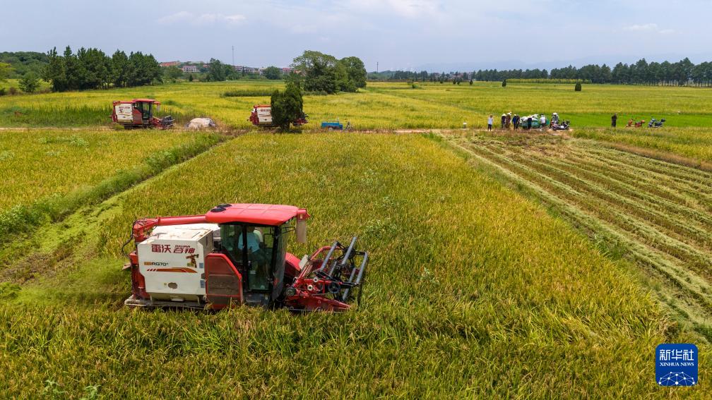 7月17日,收割机在浙江省金华市婺城区白龙桥镇上下邵村稻田里收割早稻(无人机照片)。(新华社发 胡肖飞 摄)