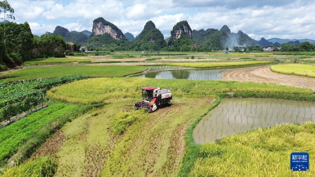 7月17日,在广西贺州市平桂区鹅塘镇,农机手驾驶收割机收割早稻(无人机照片)。(新华社发 廖祖平 摄)