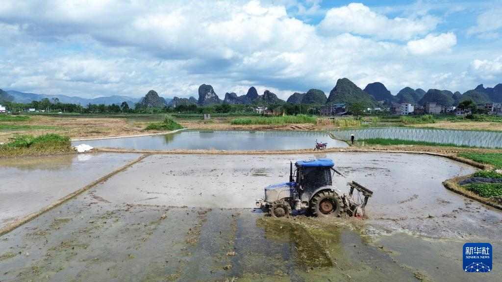 7月17日,在广西贺州市平桂区鹅塘镇鹅塘村,农机手驾驶农机犁田(无人机照片)。(新华社发 廖祖平 摄)