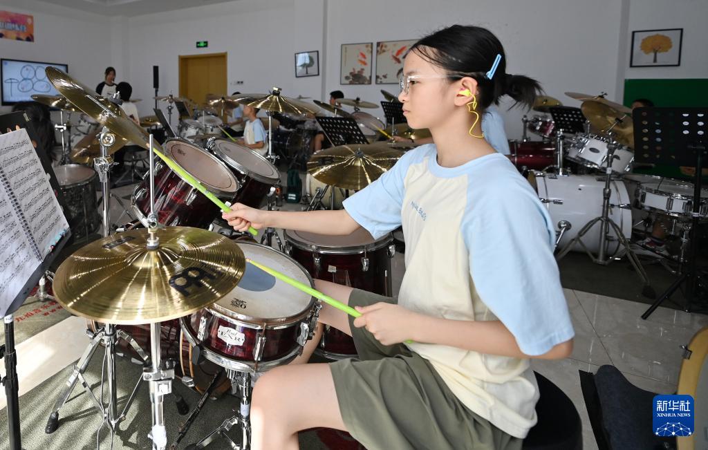 孩子们在教室里练习架子鼓(7月18日摄)。(新华社记者 李然 摄)
