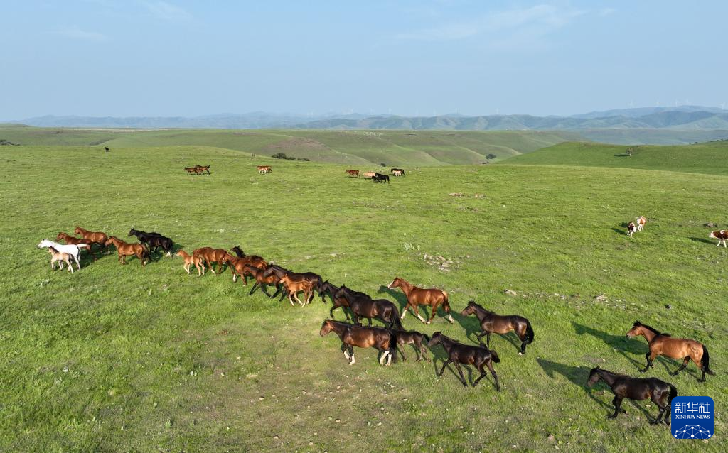7月18日拍摄的乌兰毛都草原上的马群(无人机照片)。(新华社记者 贝赫 摄)