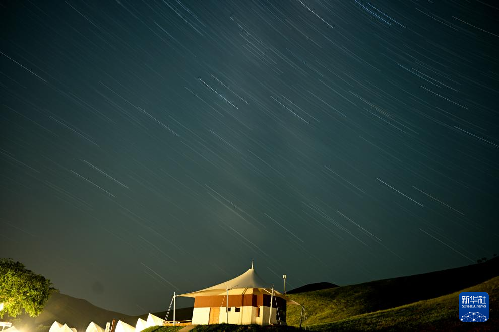 7月19日在乌兰毛都草原上的帐篷客营地拍摄的星空(长时间曝光照片)。(新华社记者 贝赫 摄)