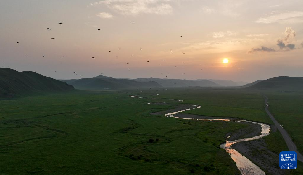 7月18日拍摄的乌兰毛都草原日落景色(无人机照片)。(新华社记者 贝赫 摄)