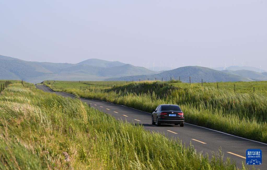 7月18日,车辆行驶在乌兰毛都草原中的公路上。(新华社记者 贝赫 摄)