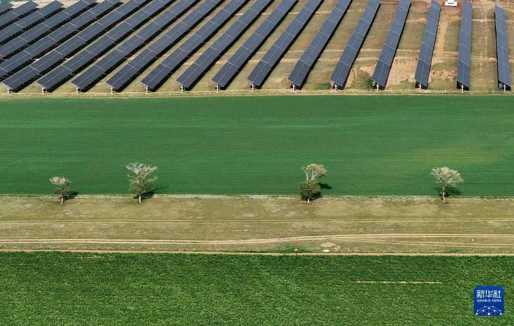 7月21日拍摄的承德市丰宁满族自治县鱼儿山镇附近的一处光伏发电场(无人机照片)。(新华社记者 杨世尧 摄)