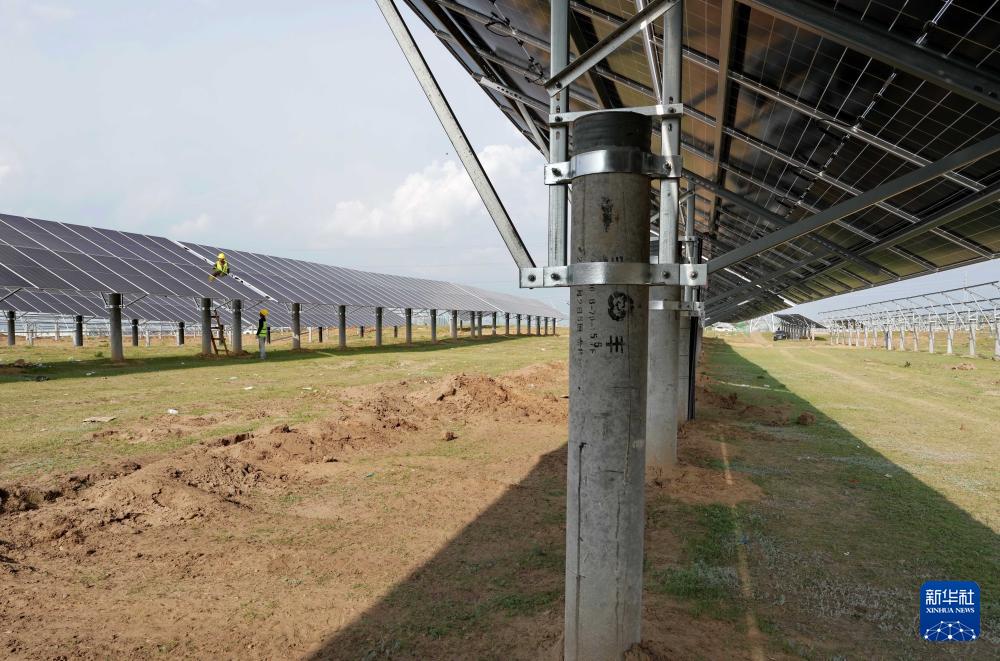 7月21日,工人在承德市丰宁满族自治县鱼儿山镇附近的一处光伏发电场建设工地工作。(新华社记者 杨世尧 摄)