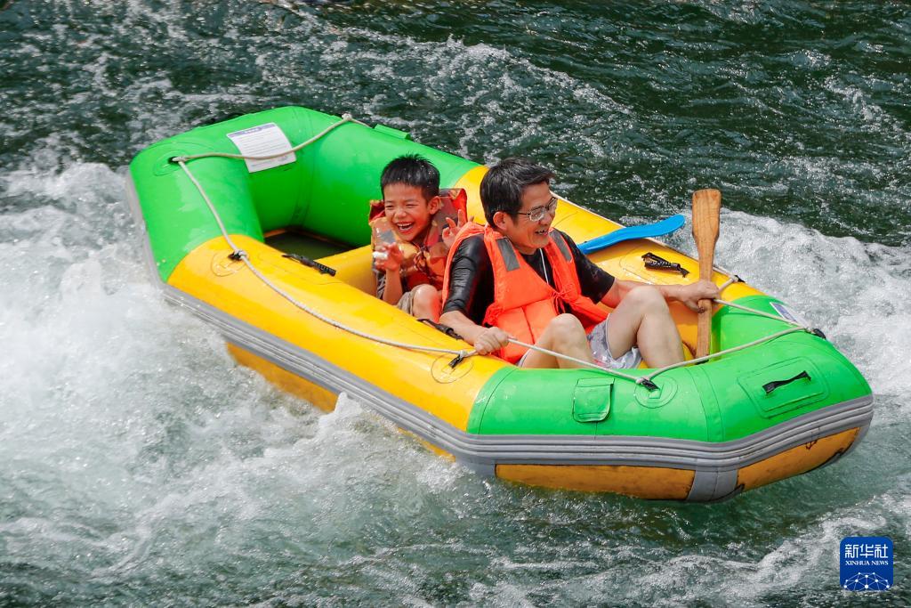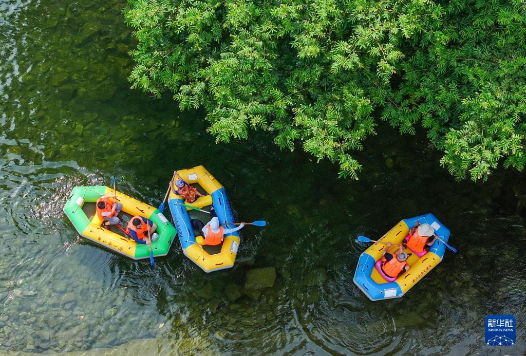 7月22日,游客在安徽省黄山市休宁县夹溪河漂流消暑。(新华社发 施亚磊 摄)