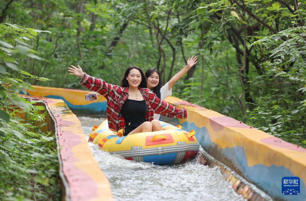 7月22日,游客在山东省临沂市沂南县铜井镇竹泉村体验丛林漂流。(新华社发 王彦冰 摄)