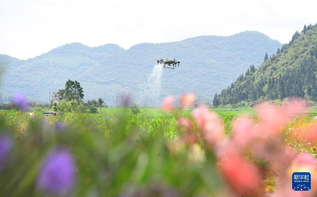 7月22日,云南省曲靖市罗平县罗雄街道外纳村的农民用无人机进行玉米飞防作业。(新华社发 毛虹 摄)