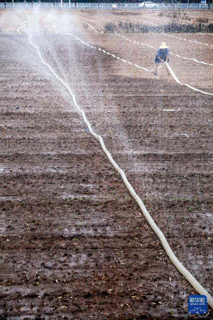 7月22日,在河南省焦作市博爱县鸿昌街道西庄村,村民为刚种下的香菜灌溉。(新华社发 程全 摄)