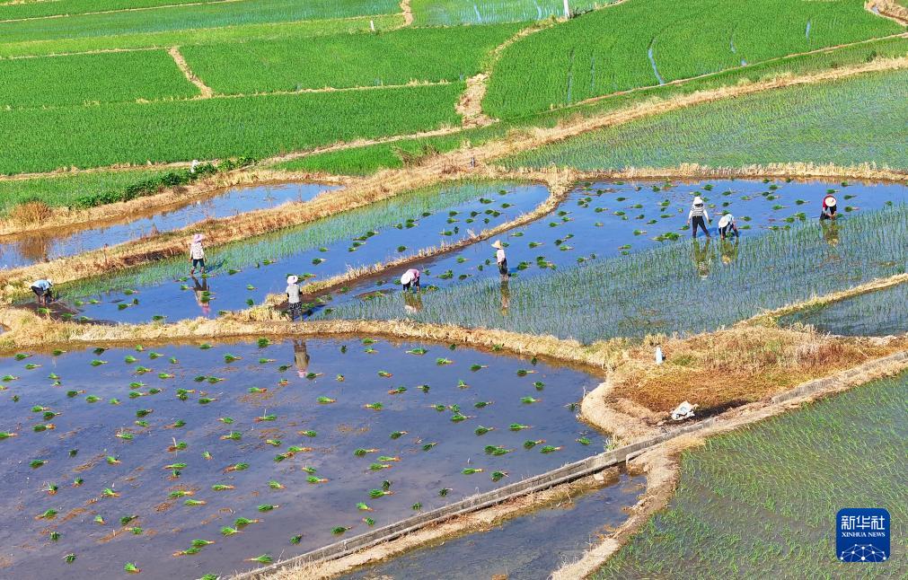 7月22日,湖南省衡阳市衡东县霞流镇农民进行晚稻插秧工作(无人机照片)。(新华社发 曹正平 摄)