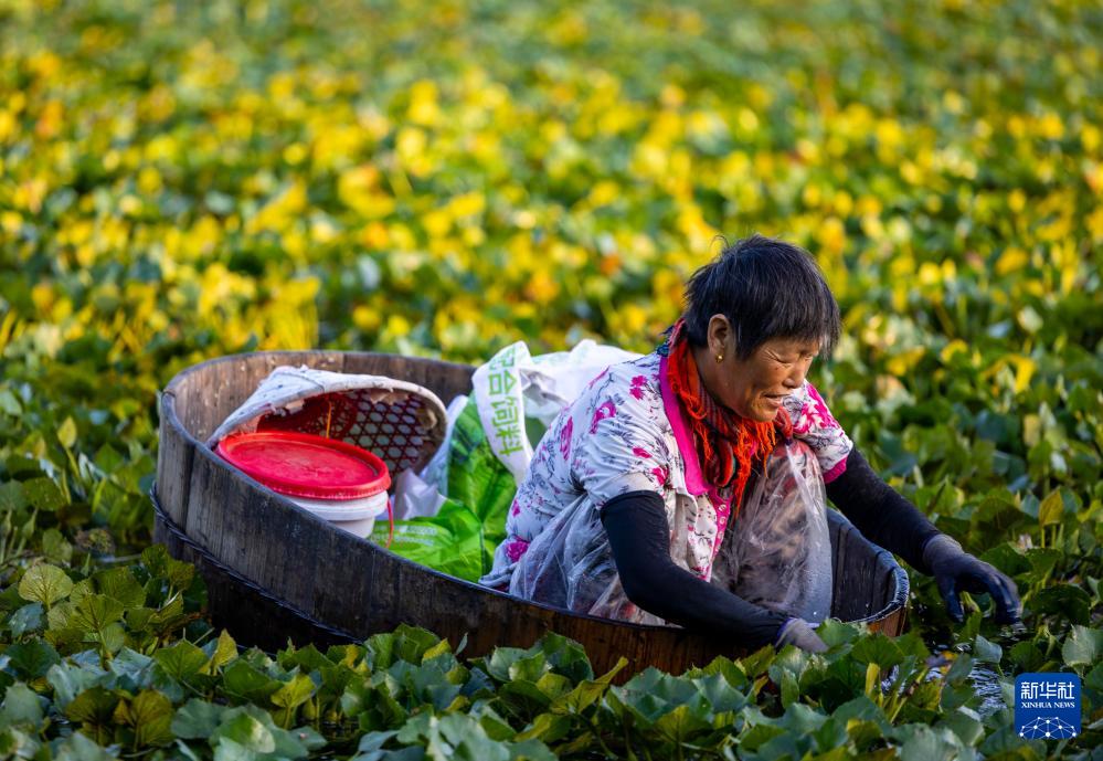 7月22日,江苏省泰州市姜堰区溱潼镇溱东村村民划着菱桶采摘菱角。(新华社发 汤德宏 摄)