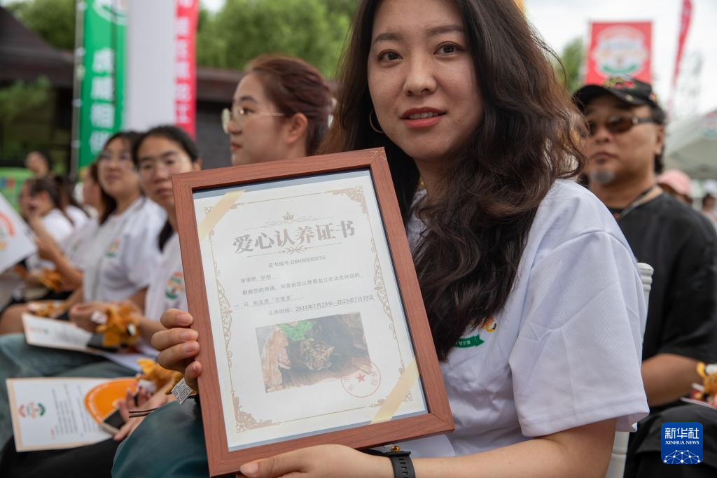 7月29日,在黑龙江东北虎林园,人们展示爱心认养证书。(新华社记者 张涛 摄)