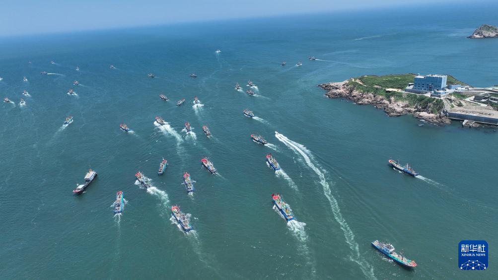 8月1日,渔船从浙江省舟山市嵊泗县嵊泗中心渔港驶向渔场(无人机照片)。(新华社发 姚峰 摄)