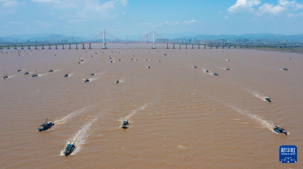 8月1日,渔船行驶在浙江省瑞安市飞云江上,准备出海作业(无人机照片)。(新华社发 孙凛 摄)