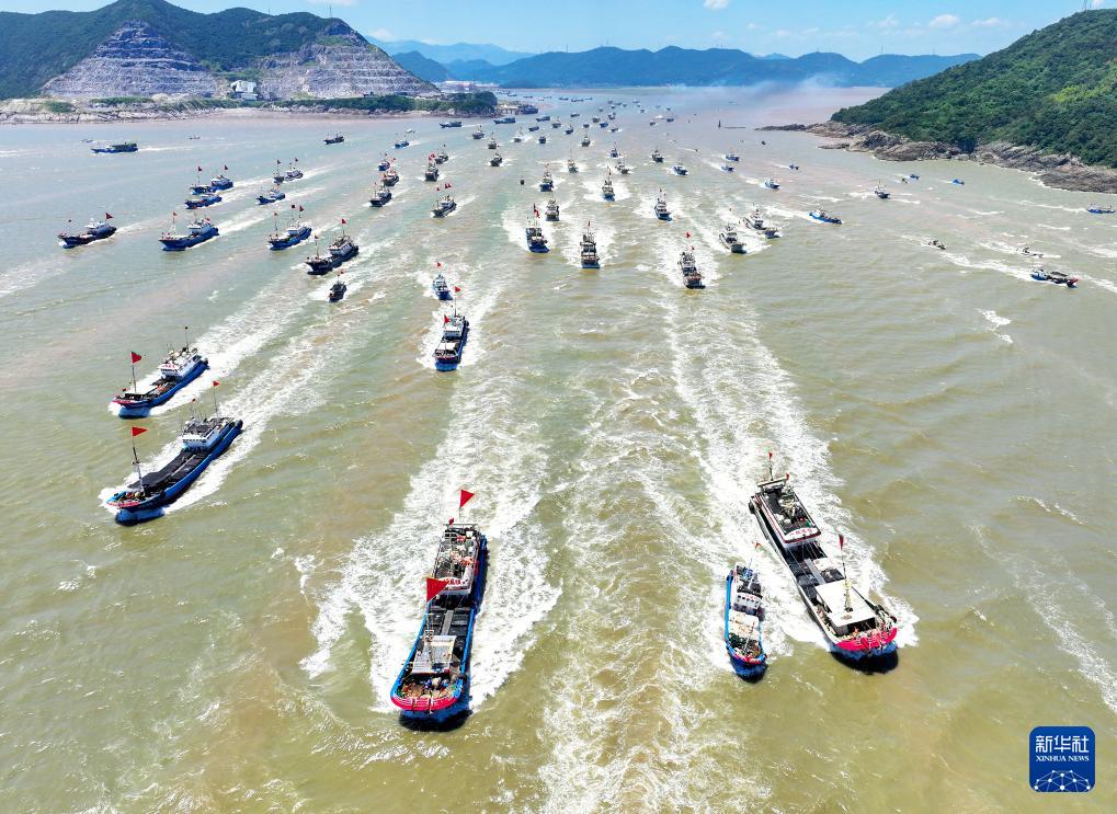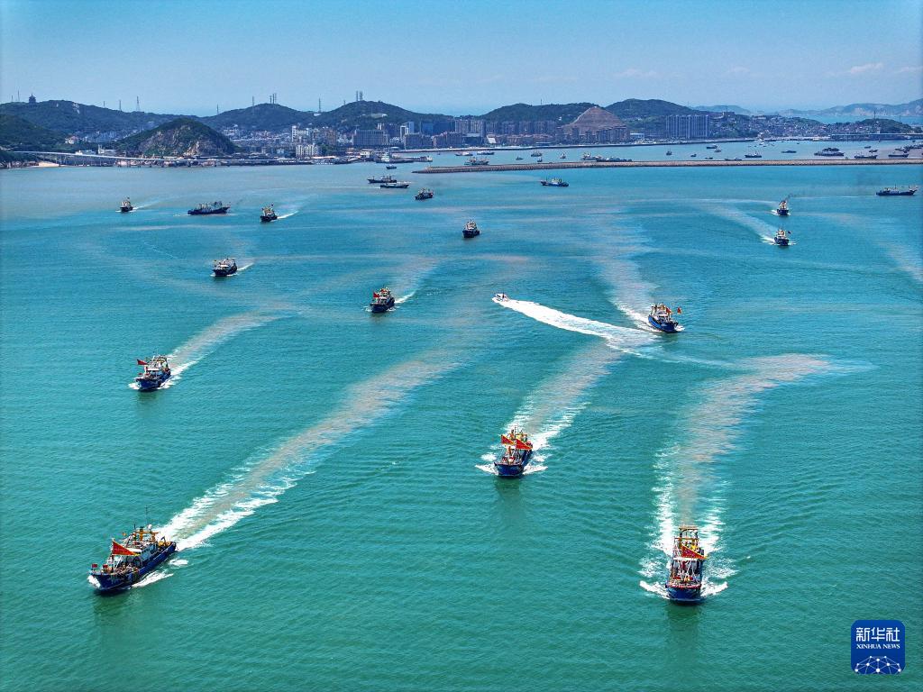8月1日,渔船驶出浙江省台州市三门县健跳渔港,奔赴渔场开启捕捞作业(无人机照片)。(新华社发 孙金标 摄)