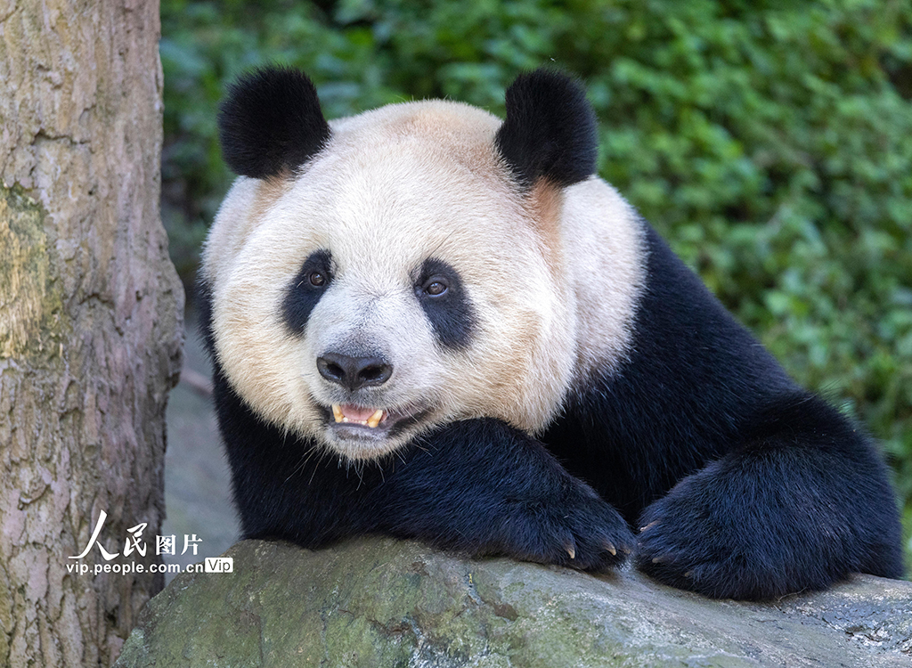 2024年8月11日,四川成都都江堰中国大熊猫保护研究中心青城山基地,大熊猫在此享用美食,嬉戏玩耍,乐享夏日的清凉,吸引众多游人参观。陈先林摄(人民图片网)