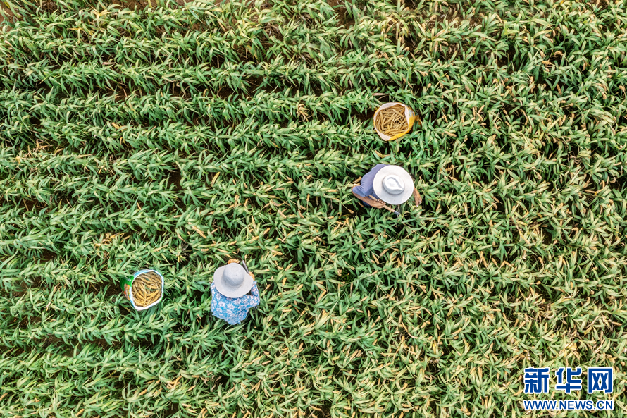 莒县峤山镇南涧村村民忙着收割谷穗(无人机照片)。新华网发(陈光金 摄)