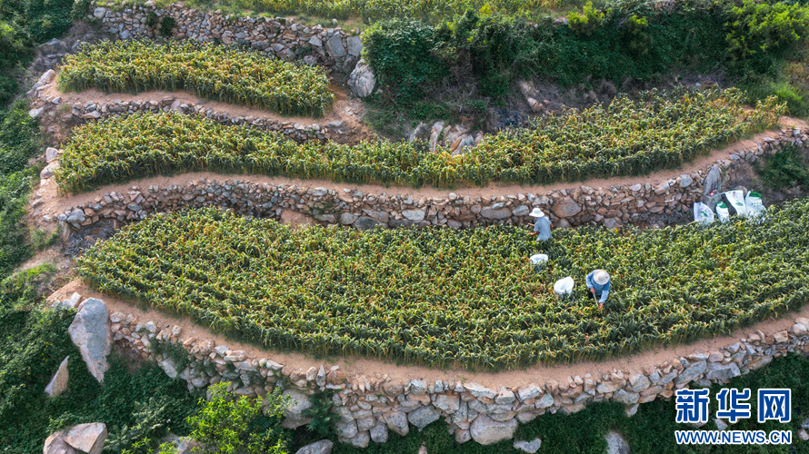 莒县峤山镇南涧村村民忙着收割谷穗。新华网发(陈光金 摄)