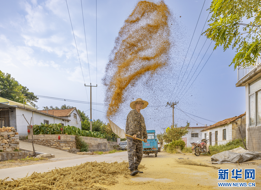 莒县峤山程家庄村民正在扬场。新华网发(陈长芬 摄)