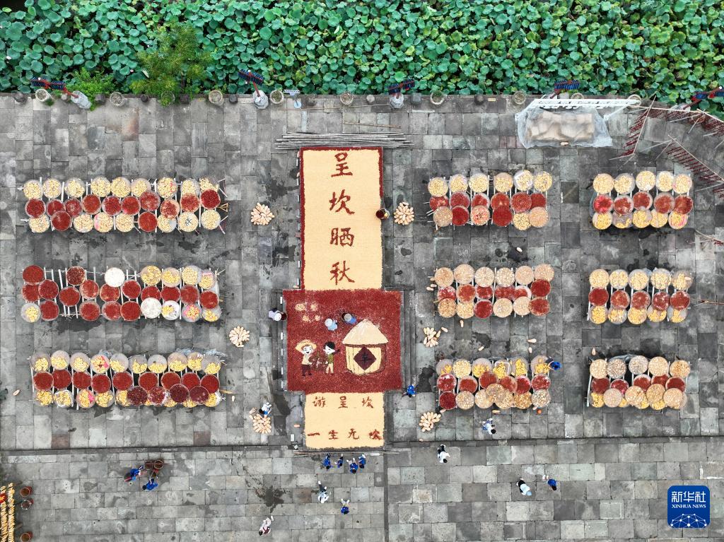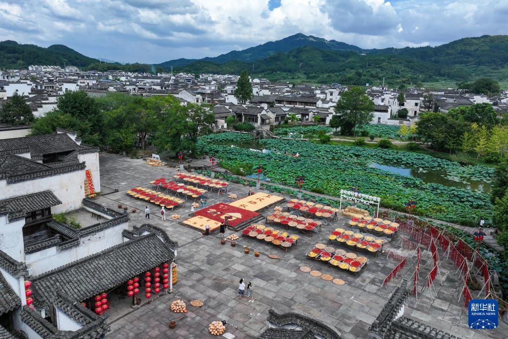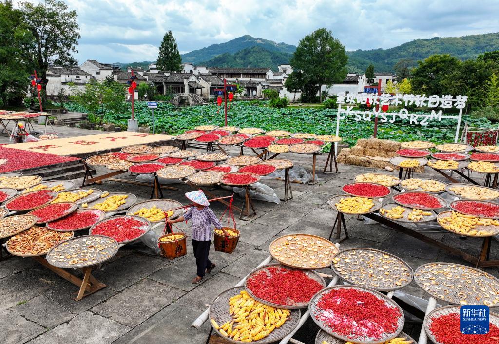 进入秋季,安徽省黄山市徽州区呈坎村村民趁着晴好天气,晾晒玉米、南瓜、红辣椒等农作物,吸引不少游客前往观赏,感受丰收的喜悦。
