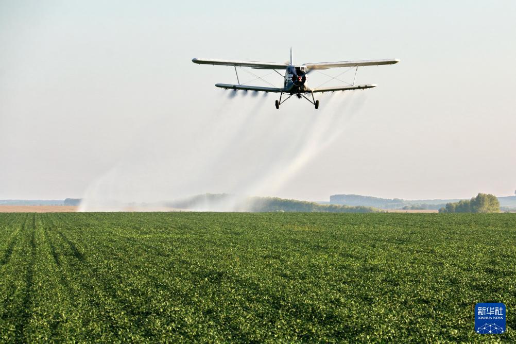 8月20日,在北大荒集团黑龙江五大连池农场有限公司大豆地块,农用飞机在进行“一喷多促”作业。(新华社发 陆文祥 摄)