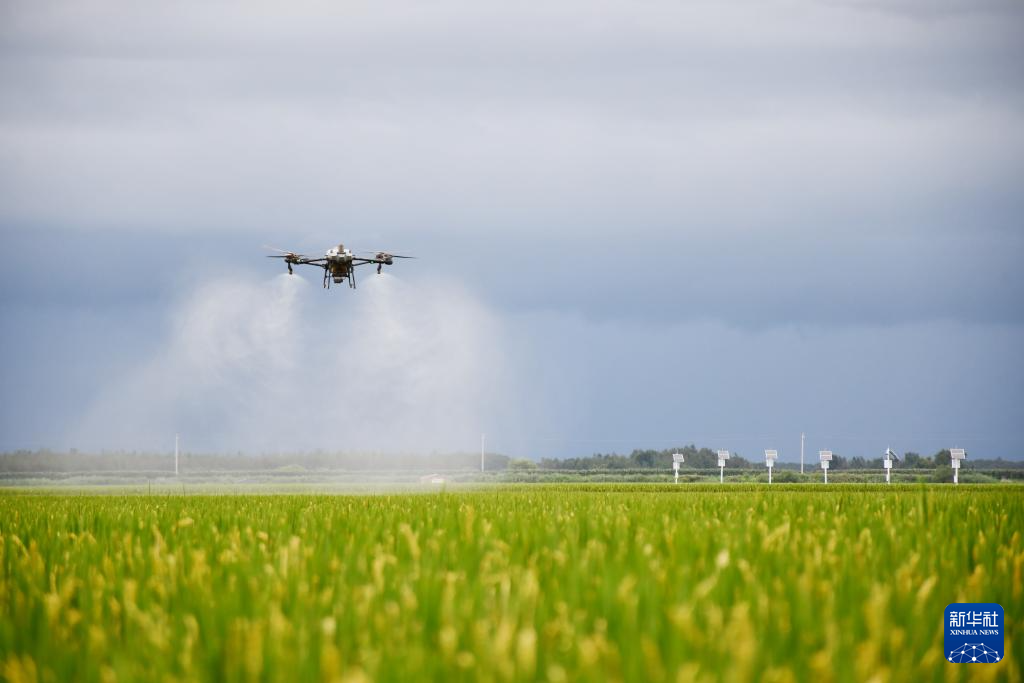 8月16日,在北大荒集团黑龙江八五六农场有限公司第六管理区水稻地块,一架无人机在进行“一喷多促”作业。(新华社发 王金彬 摄)
