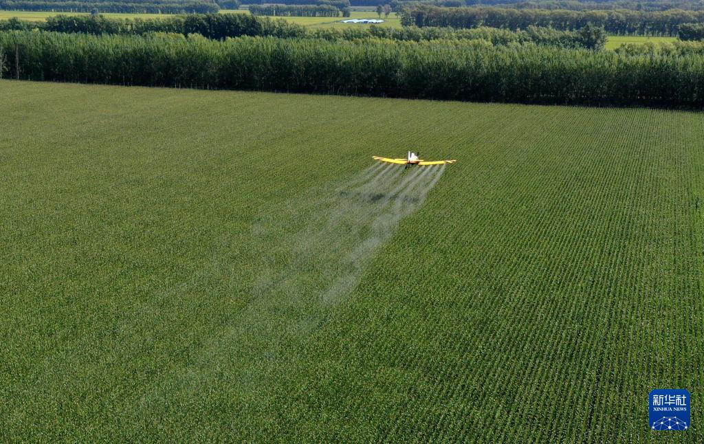 8月20日,在黑龙江北大荒农业股份有限公司友谊分公司第二管区玉米地块,农用飞机进行“一喷多促”作业(无人机照片)。(新华社发 徐宏宇 摄)
