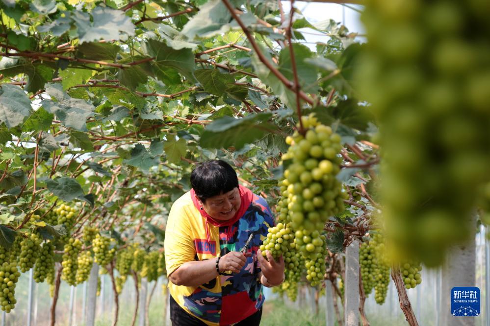 8月21日,山东省枣庄市市中区孟庄镇农民在果园里采摘阳光玫瑰葡萄。(新华社发 王海楠 摄)
