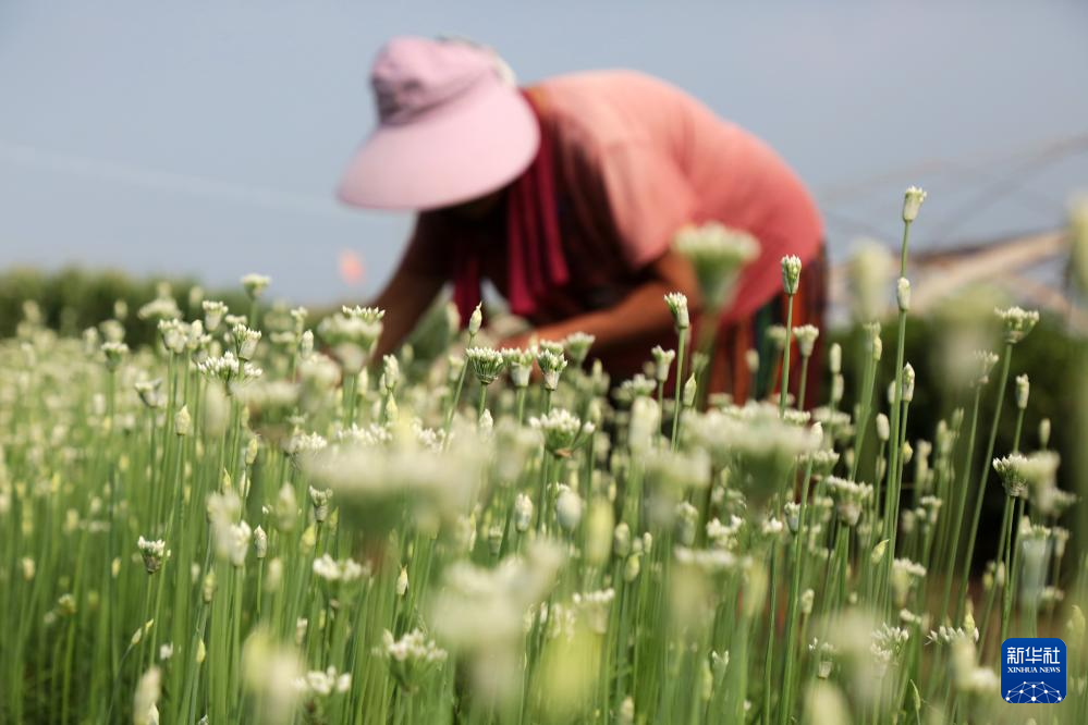 8月21日,山东省枣庄市市中区孟庄镇农民在田间查看韭菜花长势。(新华社发 王海楠 摄)