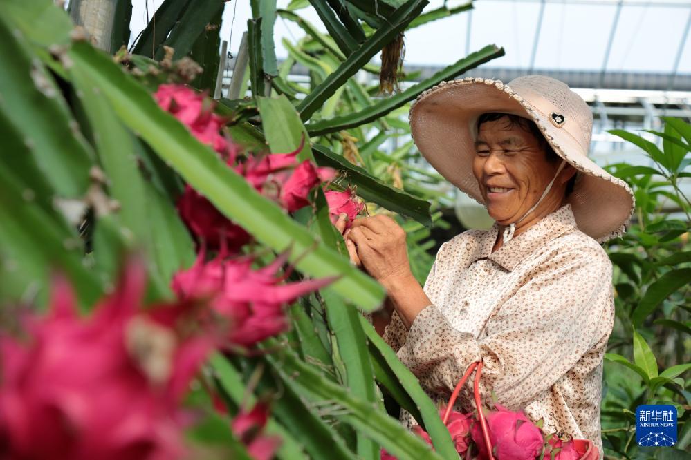 8月21日,山东省枣庄市市中区孟庄镇农民在果园里采摘火龙果。(新华社发 王海楠 摄)