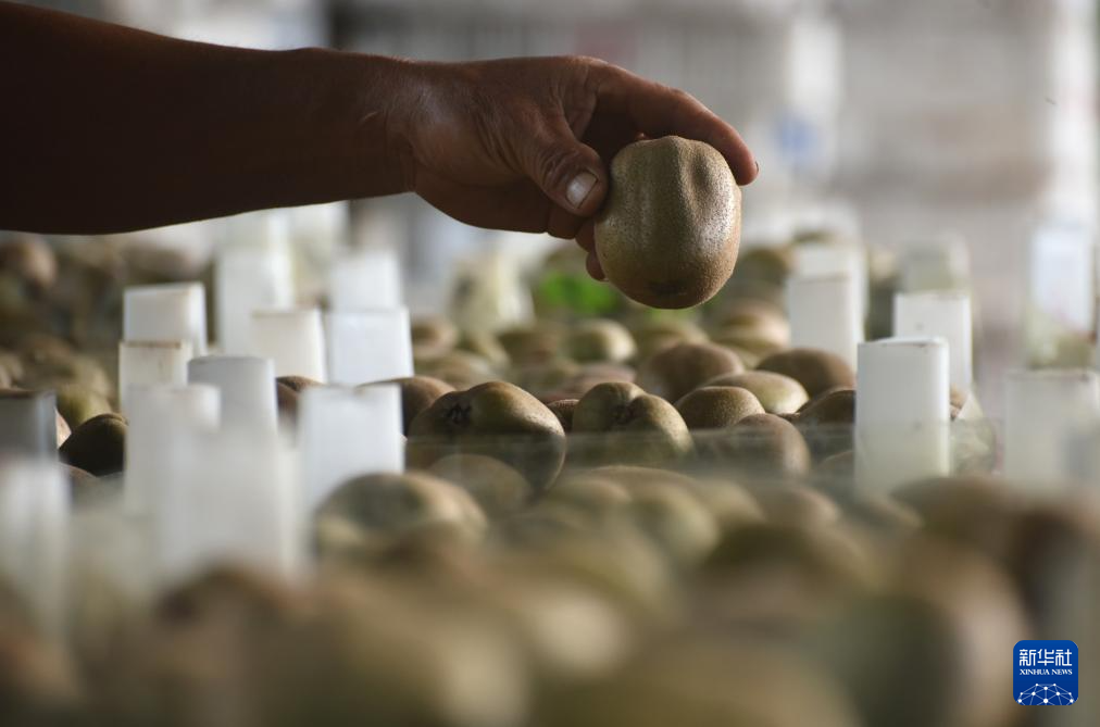 8月21日,山东省淄博市沂源县悦庄镇的农民在分拣收获的猕猴桃。(新华社发 赵东山 摄)