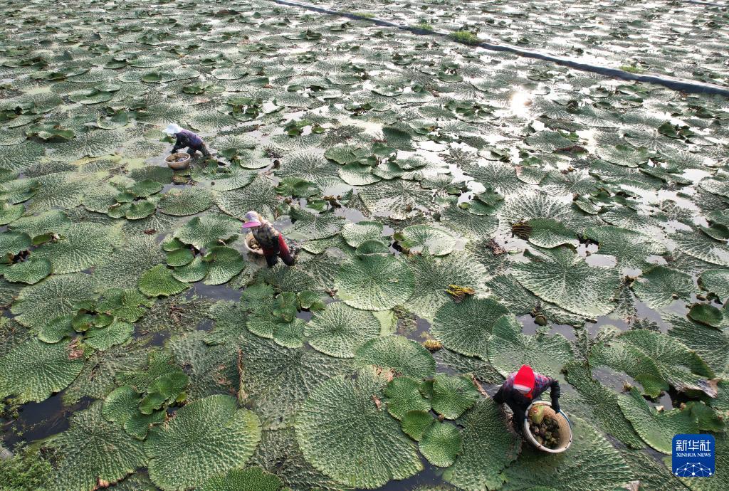 8月21日,在江苏省无锡市锡山区厚桥街道谢埭荡村,农民采收芡实(无人机照片)。(新华社发 还月亮 摄)