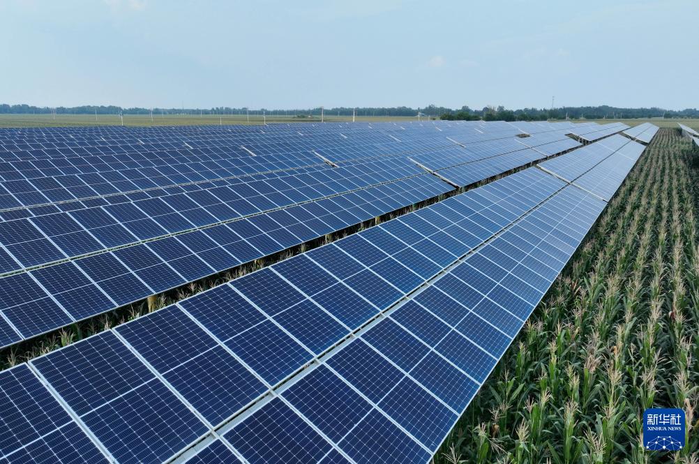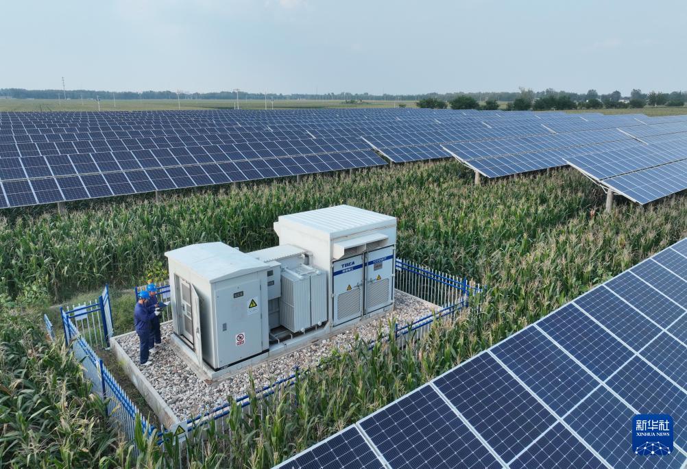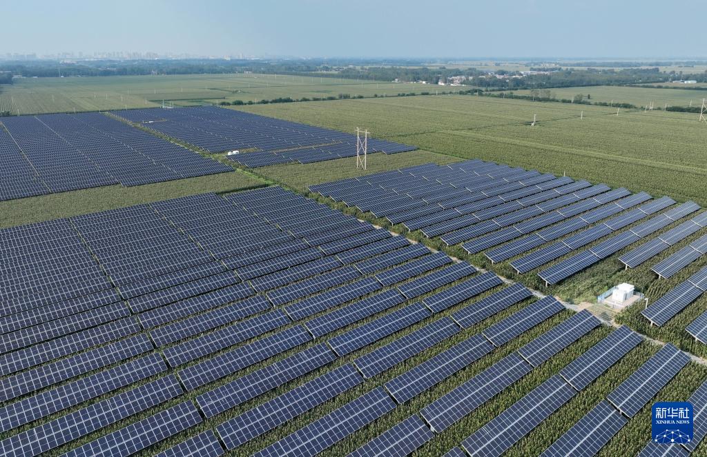 8月21日拍摄的河北省衡水市冀州区冀州镇附近的“农光互补”光伏发电场(无人机照片)。(新华社记者 杨世尧 摄)