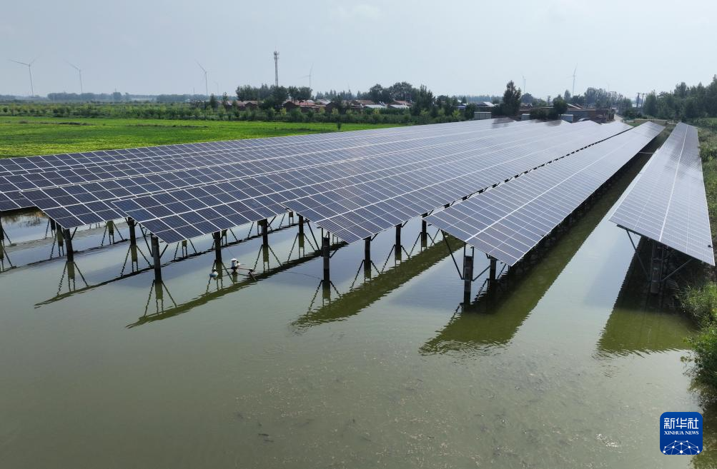 8月21日拍摄的河北省衡水市故城县三朗镇韩庄村的一处“渔光互补”光伏发电场(无人机照片)。(新华社记者 杨世尧 摄)