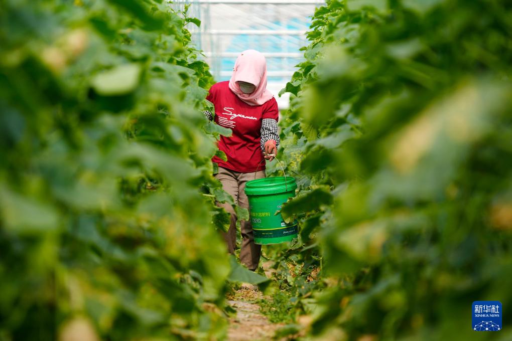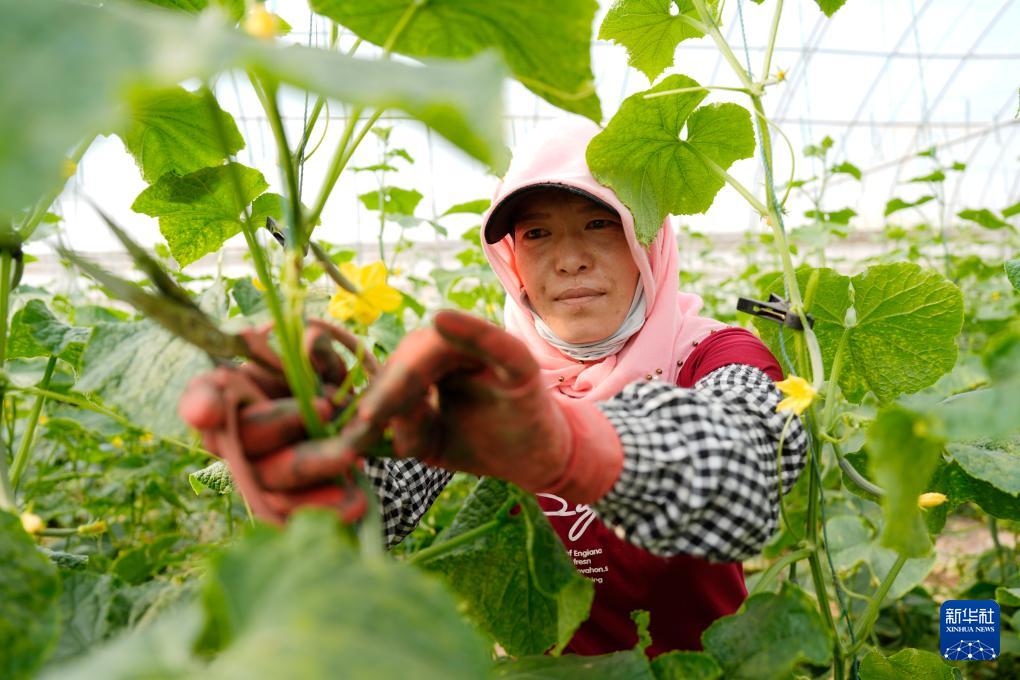 宁夏固原市原州区彭堡镇姚磨村瑞丰蔬菜产销合作社农户在温棚内采摘黄瓜(8月24日摄)。(新华社记者 王鹏 摄)