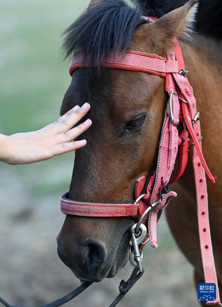 8月27日,游客在广西德保矮马王国与德保矮马互动。(新华社记者 陆波岸 摄)
