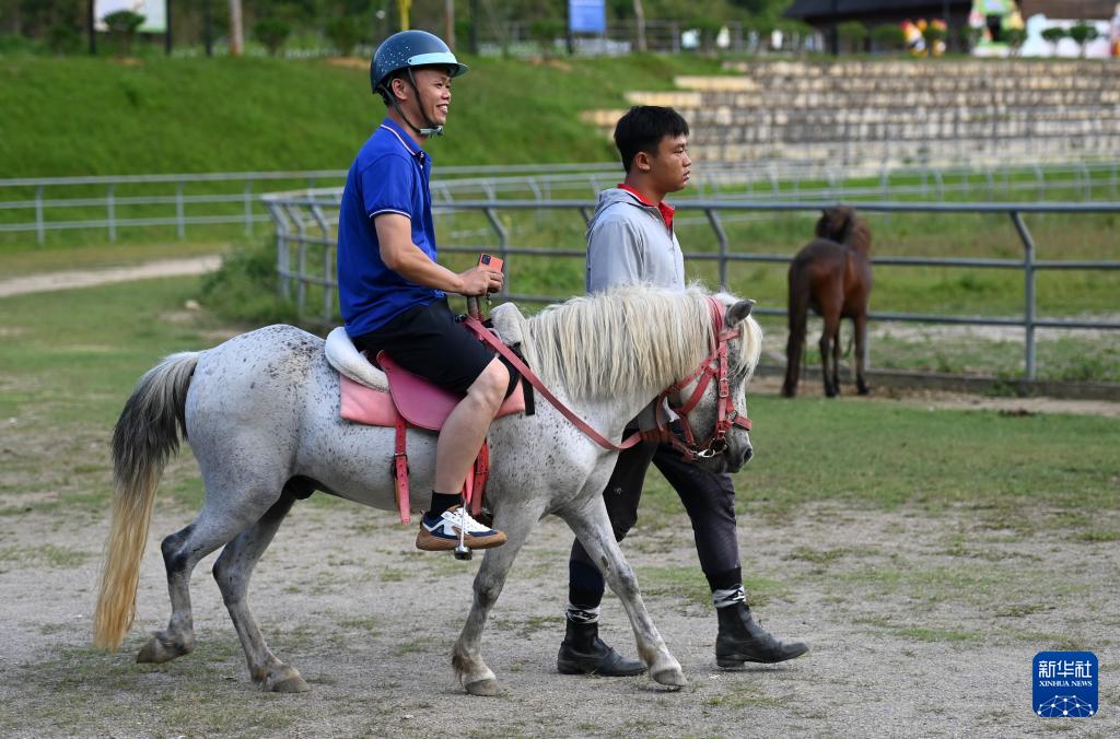 8月27日,游客在广西德保矮马王国骑德保矮马游玩。(新华社记者 陆波岸 摄)