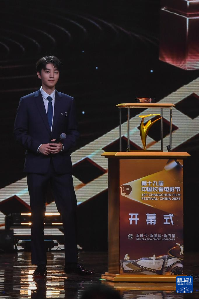8月28日,第十九届中国长春电影节形象大使、演员王俊凯在开幕式上展示“金鹿奖”奖杯。(新华社记者 张楠 摄)